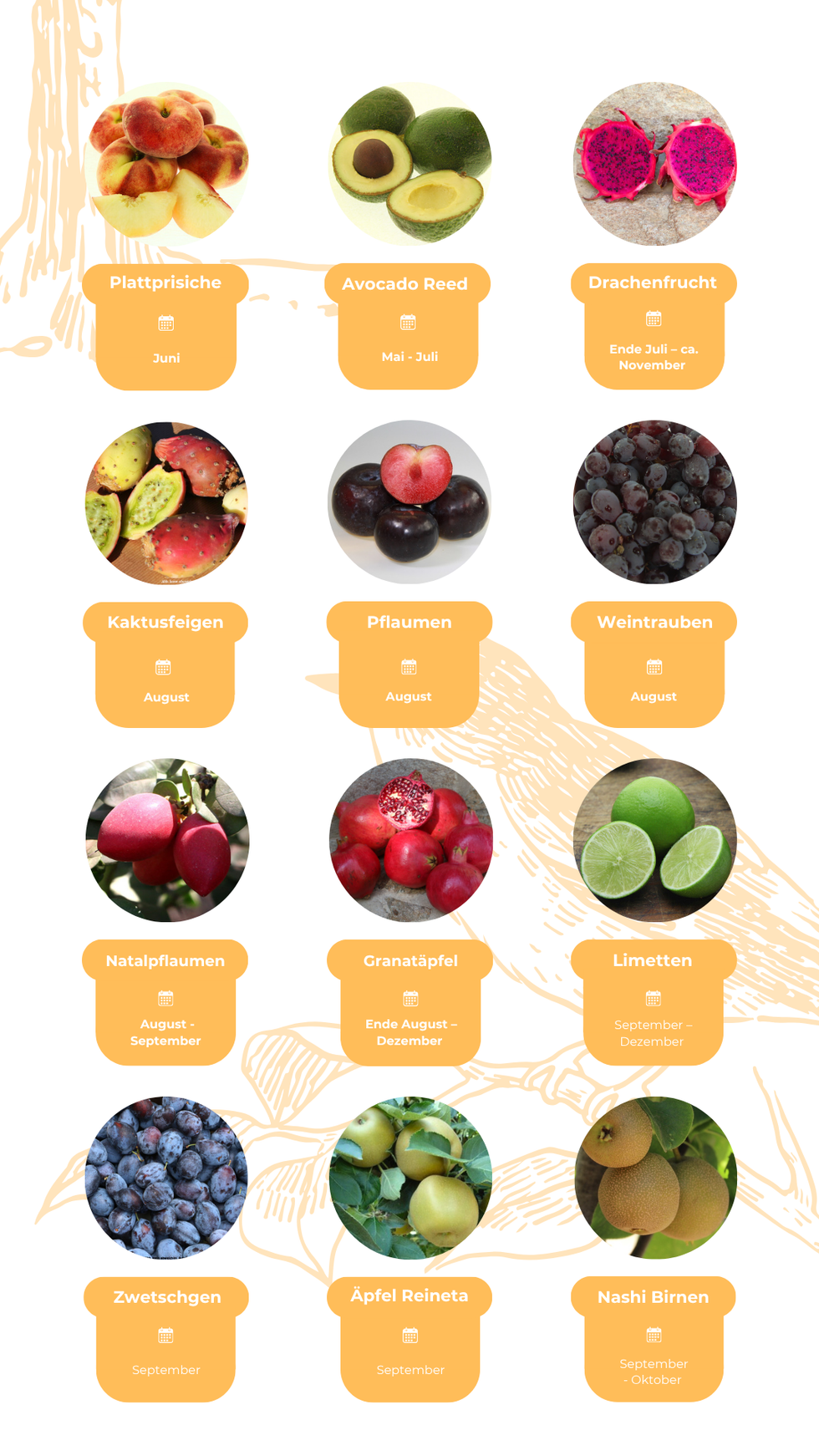 Diese Übersicht hilft Ihnen dabei, schnell und einfach herauszufinden, welche Früchte in welchen Monaten verfügbar sein können. Die Sortierung erfolgt nach den Monaten, in denen die reguläre Saison der Früchte üblicherweise beginnt.