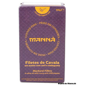 Makrelen-Filets in Olivenöl mit Curry und Chili / Manná / Filetes de cavala em azeite com caril e piri-piri, 120g